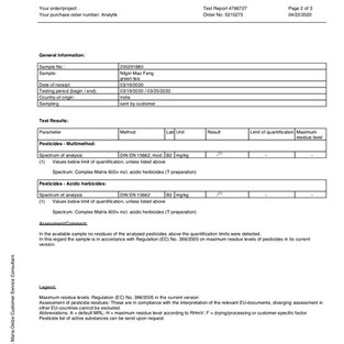 The small farmer set-up we work with makes it very complicated to certify our teas as Organic. Instead more of our teas were sent to be tested in the lab for chemical inputs. This time they were sent to SGS Institut Fresenius in Germany and put through one of the most rigorous possible testing sequences: the 'Complex Matrix 600+', a test that looks for 600 different chemical field inputs. The lab found 'no residues of the analysed pesticides'.